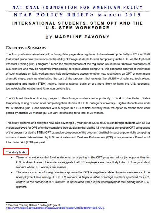近日,一则来自美国国家政治基金会(NFAP)的最新报告,无疑是给支持OPT的人们打了一针强心剂。这篇研究报告中的作者前联邦储备银行经济学家Madline Zavodny明确指出:没有证据能表明OPT学生减少了美国本土员工的就业机会。报告使用了最近9年的STEM专业国际学生数据作为分析基础。